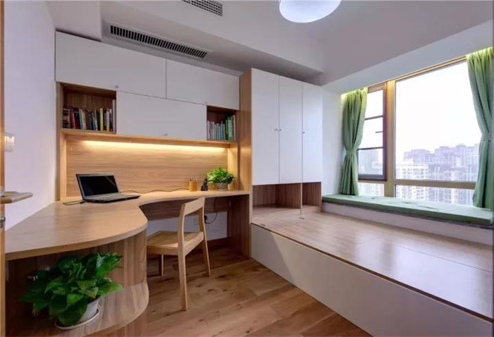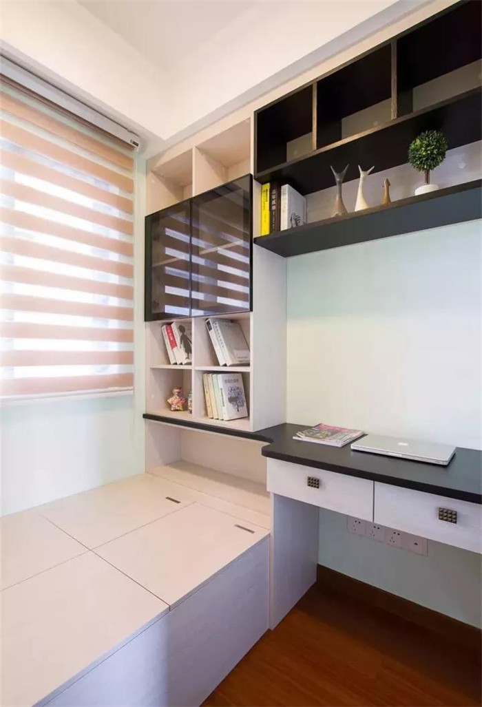如果你希望安装榻榻米的这间房既可以当卧房又可以当书房,可以选择在榻榻米床头或者床尾安装衣柜、书架和书桌,这样不仅可以收纳衣物,也可以收纳书架用来办公,一举多得。