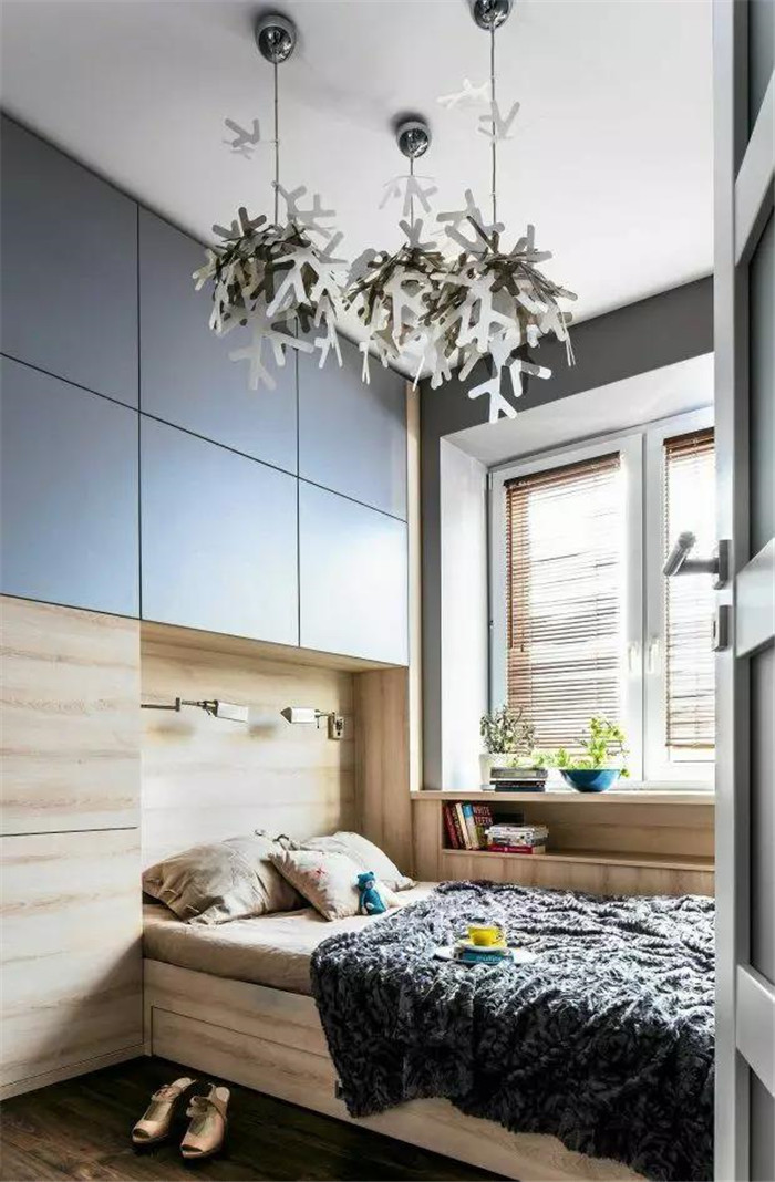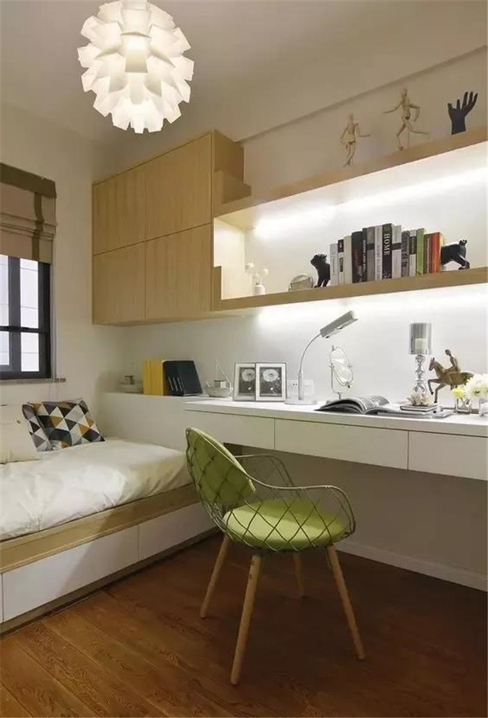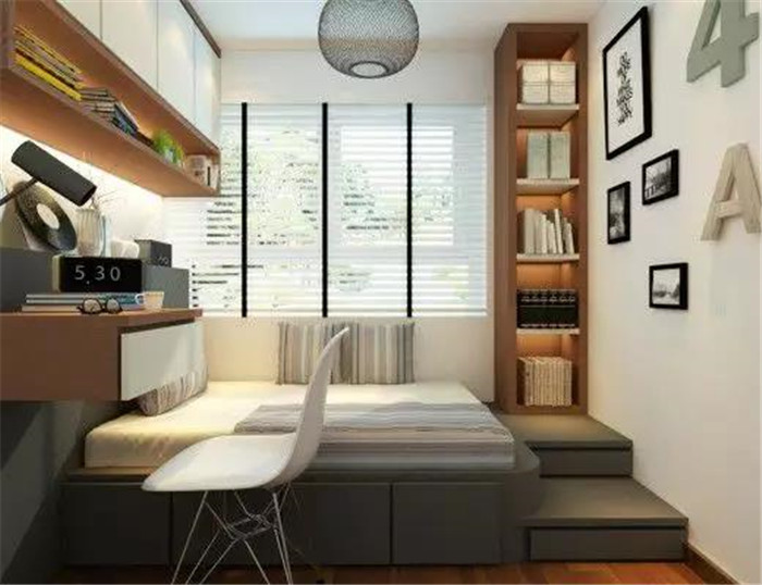 如果安装榻榻米的这间卧室,主要功能是书房或者书比较多的话,可以在榻榻米床的周围设计收纳书柜,如果床的长度不够,设计成吊柜也不错。