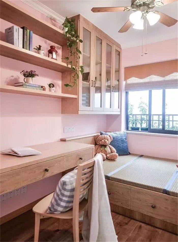 为了丰富榻榻米房的书桌,也可以取消大面积的书柜与衣柜,直接把书桌延伸到床尾,床尾的地方也可以当作座位,电脑可以充当电视,躺在床上看剧,非常不错。