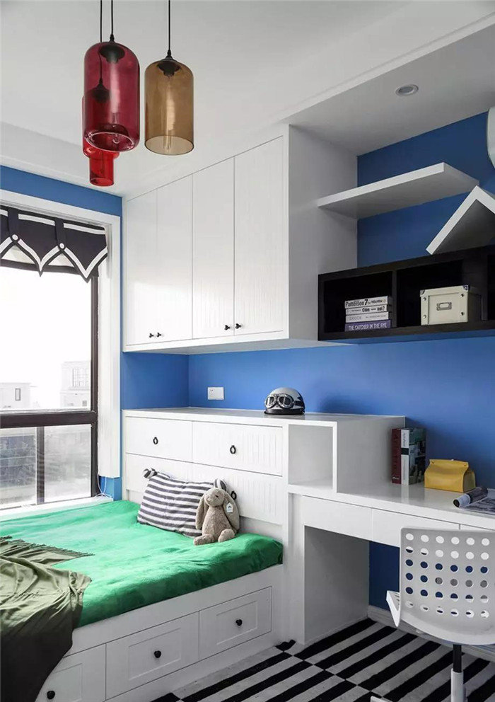 这间房满满的收纳储物设计,床下有抽屉式柜体,可以收纳日常生活小物件,床头的柜子可以收纳衣物或者被子,与衣柜一体的书架下方是个小小书桌,一方小空间,却功能满满。